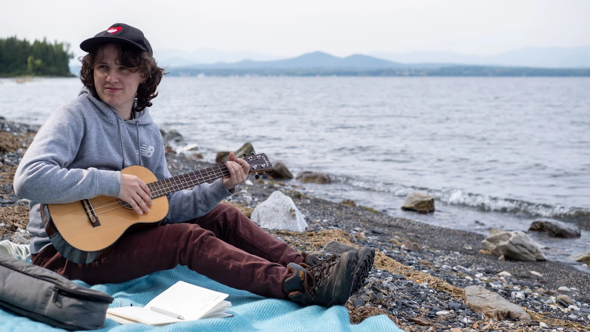 Rose writing next to Lake Champlain